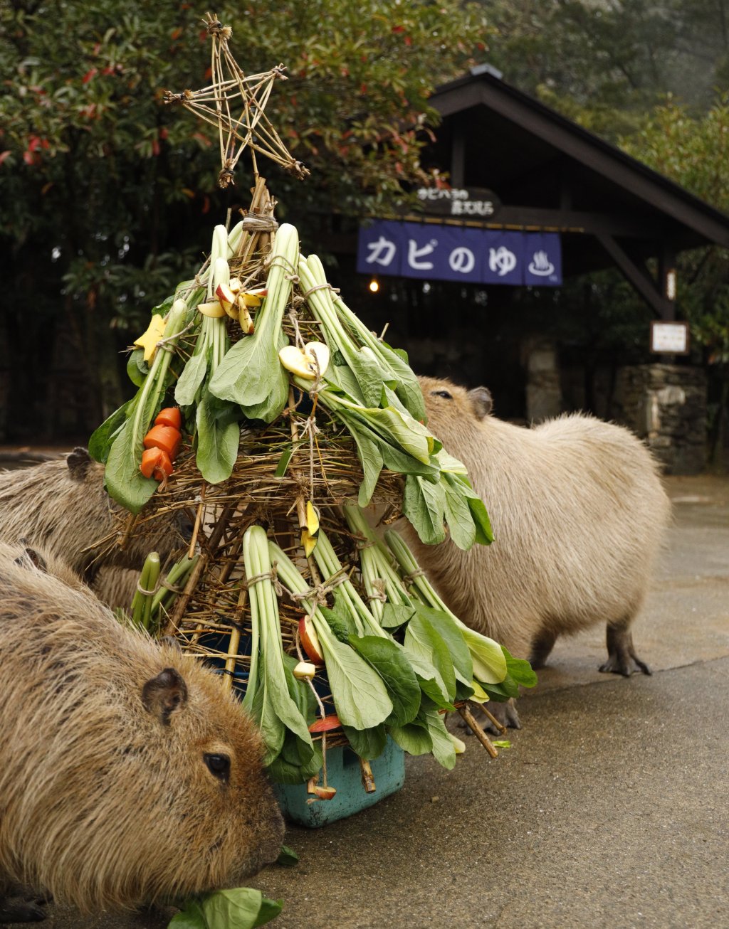 今年もカピバラたちに野菜で作ったクリスマスツリーをプレゼント!高さ約1mの大きなツリーなので食べ応え十分? かわいいカピバラたちがみんなで食べる姿をお楽しみください!